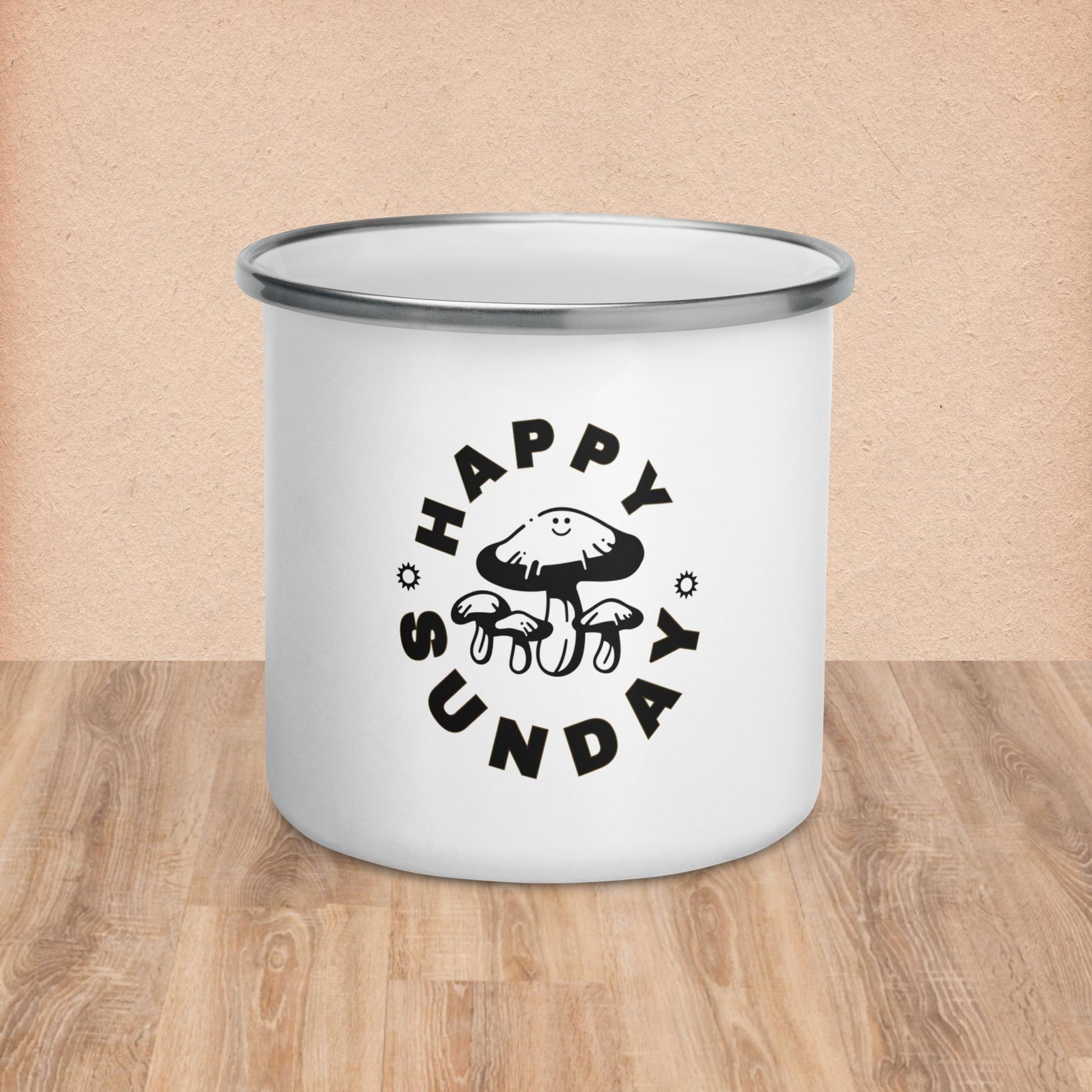 Take this Happy Sunday mug out on your next road trip. Good for sipping coffee checking the morning surf or swigging one last whiskey under the stars